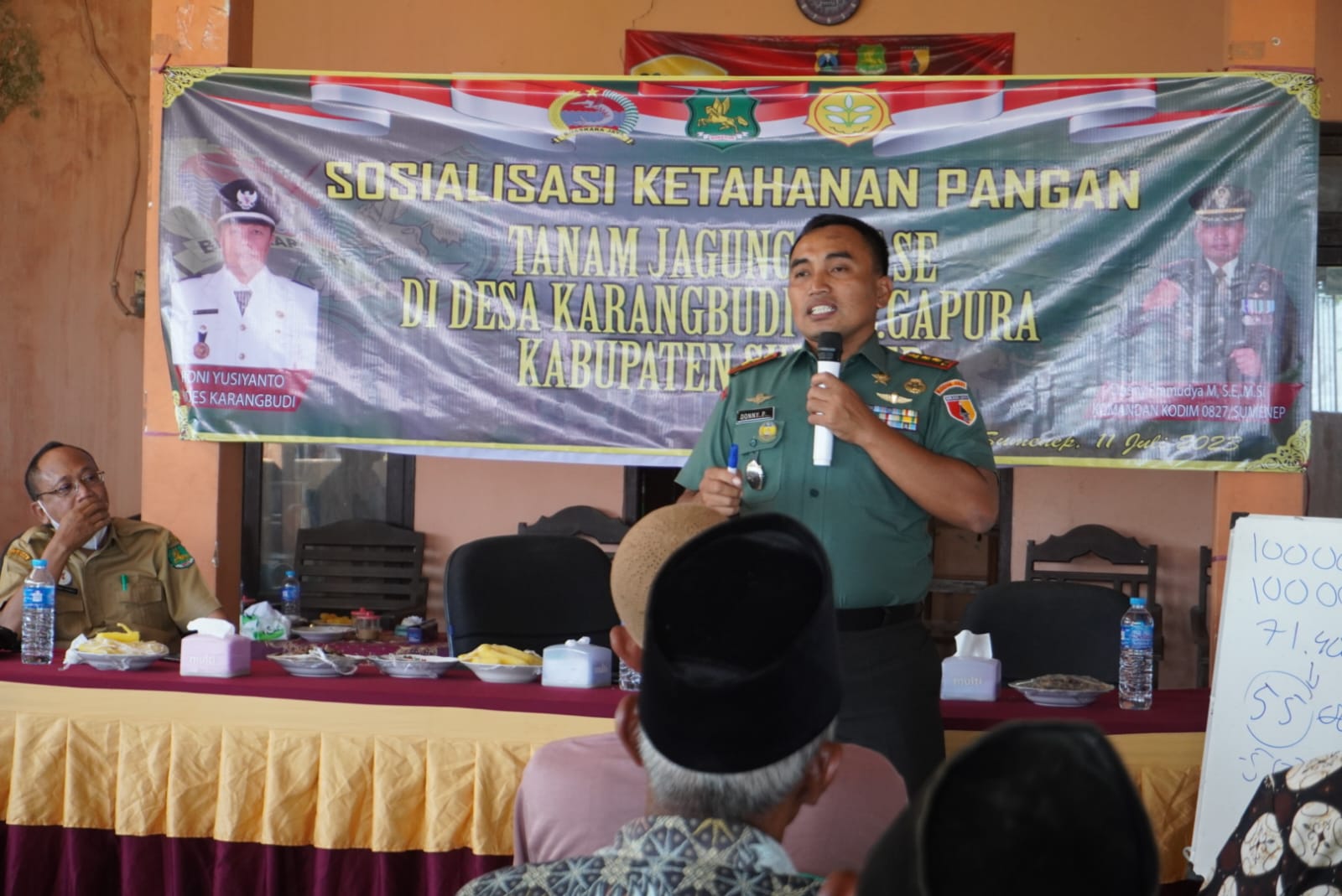 Rabu (12/07) Para petani di balai Desa Karangbudi, Kecamatan Gapura terlihat antusias saat menerima sosialisasi Ketahanan Pangan Tanam Jagung Silase yang digelar Kodim 0827/Sumenep, Selasa (11/07).